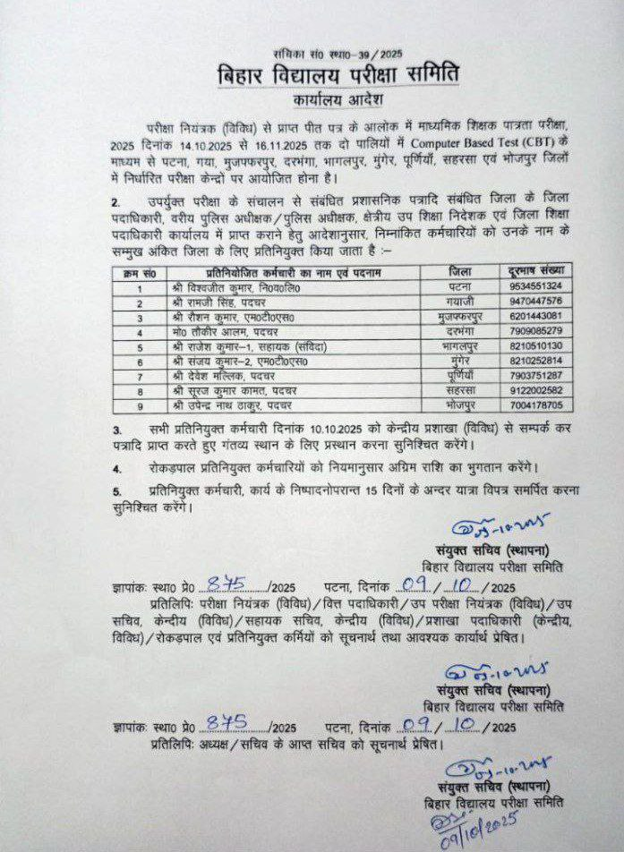 Bihar माध्यमिक शिक्षक पात्रता(STET-2025) परीक्षा, 2025 दिनांक 14.10.2025 से 16.11.2025 तक दो पालियों में Computer Based Test (CBT) के माध्यम से पटना, गया, मुजफ्फरपुर, दरभंगा, भागलपुर, मुंगेर, पूर्णियाँ, सहरसा एवं भोजपुर जिलों में निर्धारित परीक्षा केन्द्रों पर आयोजित होना है।