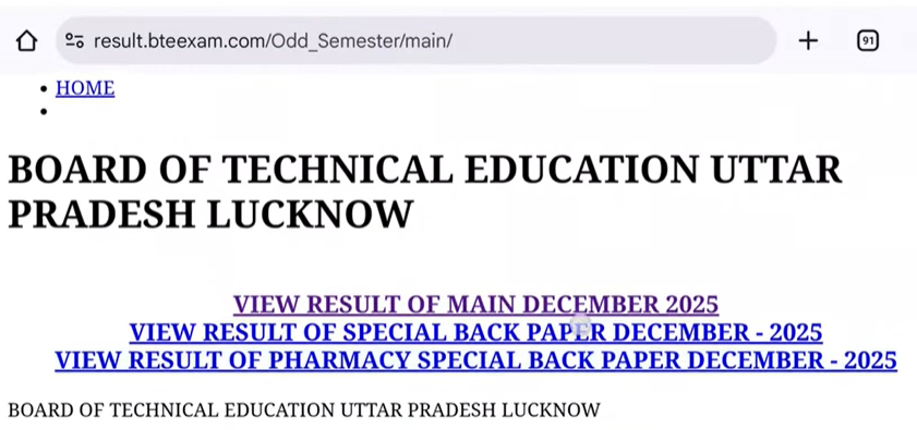- ऑफिशियल वेबसाइट पर जाएं: www.bteup.ac.in या सीधे result.bteexam.com टाइप करें।
