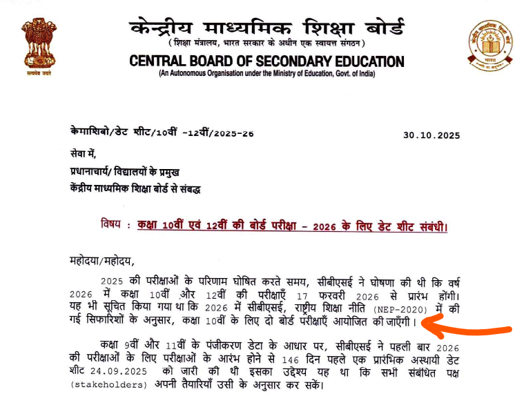 CBSE DATE SHEET 2026 PDF DOWNLOAD: केंद्रीय माध्यमिक शिक्षा बोर्ड के द्वारा आधिकारिक रूप से 30 अक्टूबर 2025 को आपका 2026 के लिए सीबीएसई बोर्ड 10th 12th डेट शीट आधिकारिक रूप से जारी कर दिया गया है और पहले भी जारी किया गया था लेकिन इसमें बिल्कुल नया और फाइनल रूप से CBSE डेट शीट जारी किया गया है इसलिए आपको यह नया वाला डेट शीट टाइम टेबल डाउनलोड करना होगा और इसी के आधार पर आपकी परीक्षा होने वाली है सभी सीबीएसई बोर्ड 10th 12th उम्मीदवार ध्यान दें और आगे दी गई लिंक से डाउनलोड करें तुरंत।