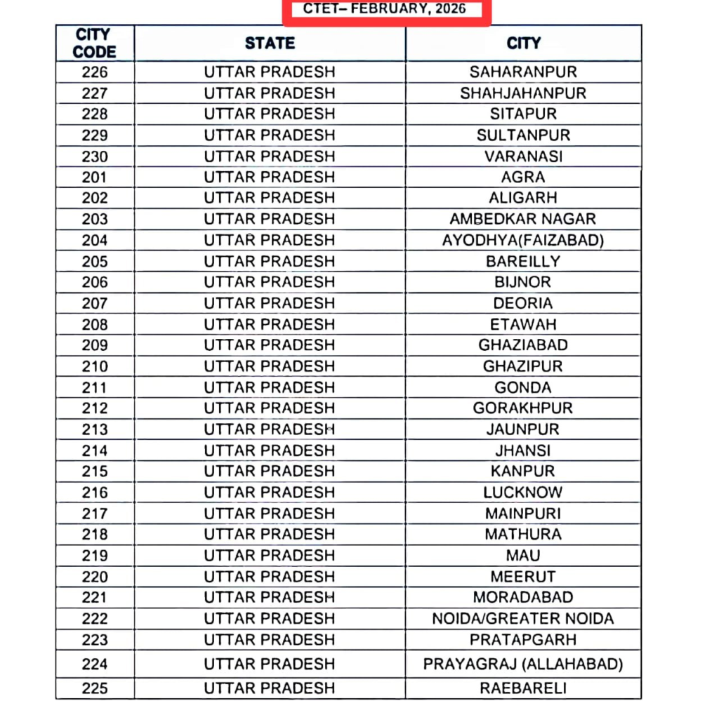 | CITY CODE | STATE | Ctet Exam city Center 2026 |