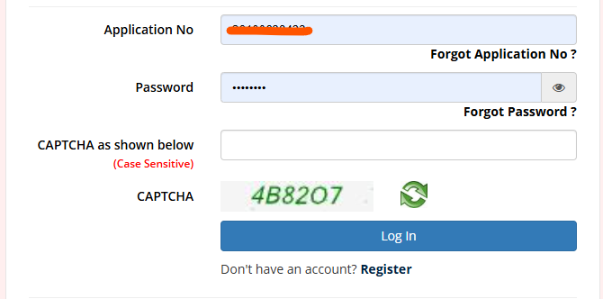 - अपना एप्लीकेशन नंबर और पासवर्ड (या डेट ऑफ बर्थ) एंटर करें।