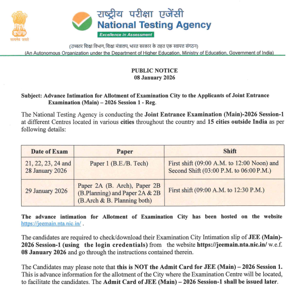 प्रिय JEE aspirants, अगर आप JEE Main 2026 की तैयारी कर रहे हैं, तो अब समय आ गया है कि आप अपनी परीक्षा की प्लानिंग को और मजबूत बनाएं। नेशनल टेस्टिंग एजेंसी (NTA) जल्द ही JEE Main 2026 सेशन 1 की एडवांस सिटी इंटीमेशन स्लिप आपके लिए जरूरी है।