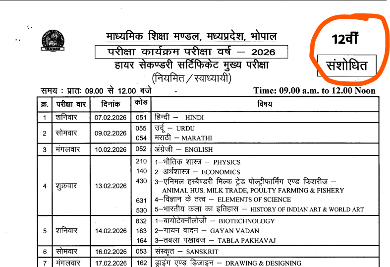 27 अक्टूबर 2025 को आधिकारिक रूप से माध्यमिक शिक्षा मंडल मध्य प्रदेश भोपाल के द्वारा नोटिस जारी किया गया और बताया गया है कि हायर सेकेंडरी मुख्य परीक्षा के कार्यक्रम टाइम टेबल में जो कुछ बदलाव किया गया है यहां पर देखें यह बताया गया की 3 मार्च 2026 को होने वाली परीक्षा को अब 5 मार्च 2026 को आयोजित किया जाएगा यह बड़ा अपडेट बोर्ड के द्वारा एमपी बोर्ड टाइम टेबल 2026 में किया गया है बदलाव।
