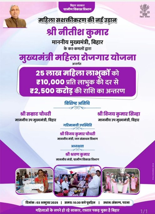 3 अक्टूबर 2025 को मुख्यमंत्री नीतीश कुमार ने 75 लाख महिलाओं के खाते में ₹10,000 ट्रांसफर किए – कुल ₹5,000 करोड़! पहले चरण में 75 लाख महिलाओं को फायदा। लिस्ट चेक करने के लिए: