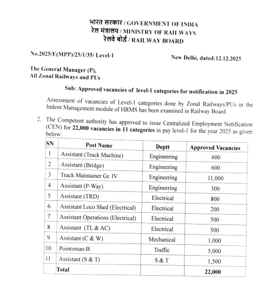 रेलवे ग्रुप डी की 22000 पदों पर नई भर्ती आने वाली है इसका आधिकारिकनोटिफिकेशन यहां पर देख सकते हैं