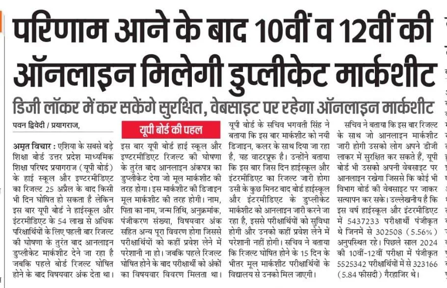 यूपी बोर्ड मार्कशीट के बारे में यूपी बोर्ड सचिव ने जानकारी दी है कि इस बार रिजल्ट के साथ जो ऑनलाइन मार्कशीट जारी होगी उसको लोग अपने डिजील लाकर अकाउंट पर सुरक्षित कर सकते हैं यूपी बोर्ड भी उसको अपनी वेबसाइट पर ऑनलाइन रखेगी जिससे कोई भी किसी भी विभाग की वेबसाइट पर जाकर सत्यापन कर सकेगा उल्लेख नहीं है कि इस वर्ष 54 लाख से अधिक छात्र-छात्राओं ने पंजीकरण किया था लेकिन कुछ उम्मीदवार परीक्षा नहीं दिए हैं जिसके कारण अब लगभग 50 लाख से अधिक छात्र-छात्राओं का रिजल्ट जारी किया जाना है।